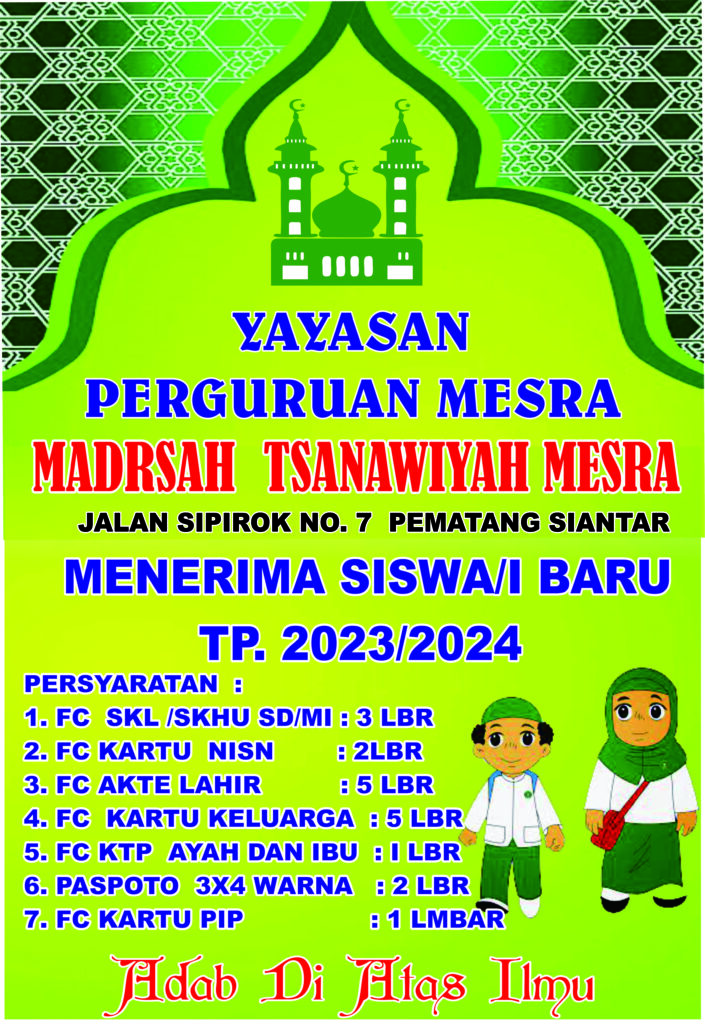 Assalamualaikum wr wb…. MTs MESRA sudah membuka pendaftaran bagi siswa siswi Baru Tahun Pelajaran 2023 / 2024. Bapak Ibu daftarkan segera Putra Putri nya sebelum kuota habis….